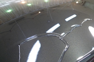 カルシウムやケイ素成分が溶けこんだ水滴が蒸発すると、それらの成分が濃縮され、塗装面に頑固に付着します。酸化カルシウムや酸化ケイ素は、洗剤でも有機溶剤でも落ちません。塗装に付いたウォータースポットは塗装よりも硬く、無理に研磨すると塗装も一緒に研磨してしまいます。