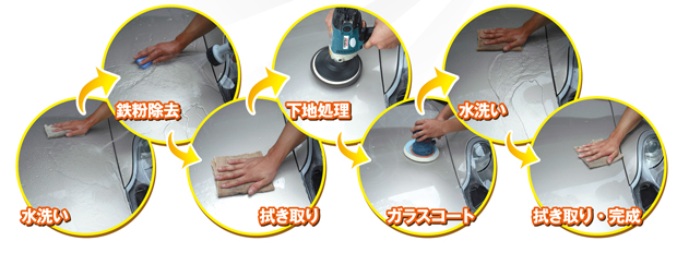 塗膜はガラス面と同じ性質になるので、施工後の洗車は水洗いのみでOK。汚れや雨ジミも水洗いで簡単に除去できます。